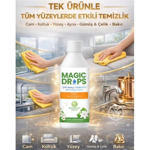 Magic Drops, hayatınızı kolaylaştırmak için geliştirilmiş ultra konsantre, çok amaçlı bir temizlik maddesidir. Benzersiz formülü sayesinde yalnızca birkaç damla ile güçlü temizlik performansı sunar. Ev, ofis ve tüm yaşam alanlarında güvenle kullanılabilir.