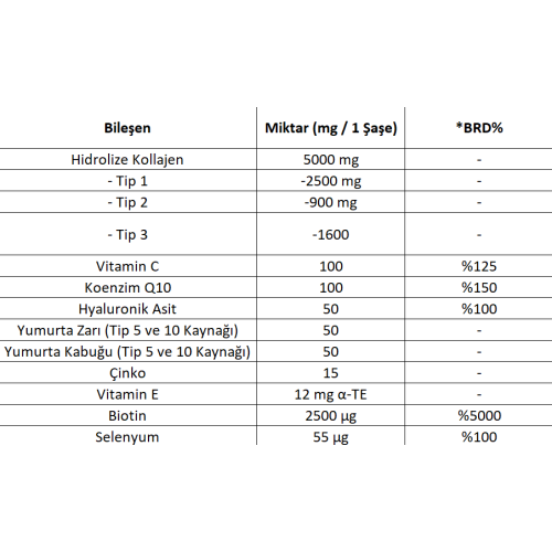 İçerik 30 Sachet x 10.000 mg Hidrolize Kolajen - Tip 1 - Tip 2 - Tip 3 Yardımcı Madde (Hacim Artırma Amaçlı): Maltodekstrin, L-askorbik asit, Koenzim Q10, Hyaluronik asit, Yumurta zarı (Tip 5 ve 10 Kaynağı), Yumurta kabuğu (Tip 5 ve 10 Kaynağı), Çinko sülfat Aroma Verici: Doğal yaban mersini aroması D-a-tokoferol Tatlandırıcı: Steviol glikozitleri (E 960) D-biotin Sodyum selenit