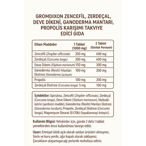 | ZENCEFİL, ZERDEÇAL, DEVE DİKENİ, REISHI, PROPOLİS İÇERİKLİ TAKVİYE EDİCİ GIDA |